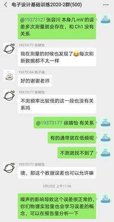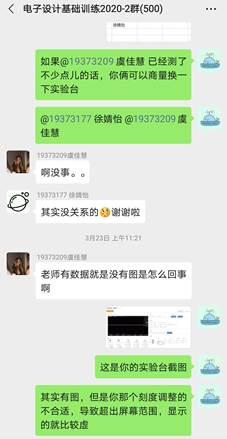 姜越19373712:这一次的实验课,我从最初的手忙脚乱、满头雾水,到后来能够迅速地调试设备、生成波形、记录数据,再到最后顺利完成报告,离不开老师与助教的帮助。他们精心地为我们准备了大量材料以及问题反馈,他们每天在微信群实时答疑提供帮助,尤其在我的设备低频无显示的时候他们耐心地给我提供了许多解决方案,使我最终能够完成实验任务。我们每个人的实验只有几小时,但是张老师却每天都在实验室为我们保驾护航,非常感谢老师与助教的辛勤付出,我很期待下一次的实验课!